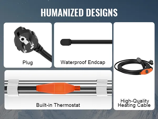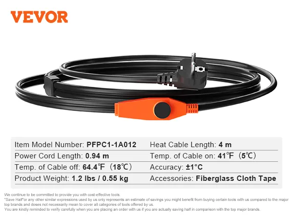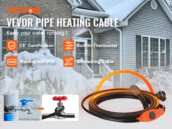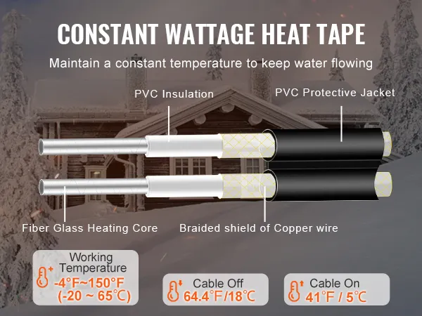 Longitud perfecta: Nuestro cable calefactor de 4 m para tuberías tiene un cable de alimentación de 0,94 m, lo que le permite funcionar a largas distancias. Fabricado con núcleo calefactor de fibra de vidrio, aislamiento de PVC, blindajes trenzados de alambre de cobre y cubierta protectora de PVC, este cable calefactor ofrece alta seguridad y un rendimiento duradero en duras condiciones invernales.