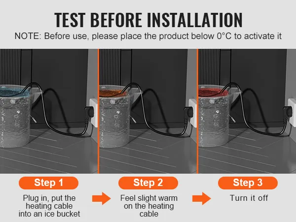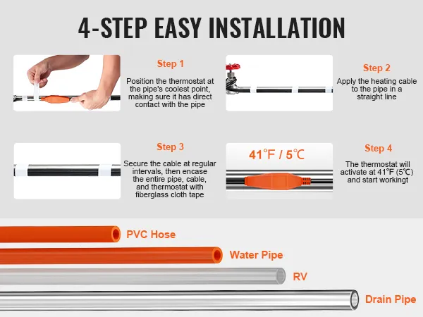 Instalación conveniente: El cable calefactor preensamblado está diseñado para una fácil instalación. Colóquelo en línea recta, sin cruzar ni superponer el cable. Asegúrese de que el termostato y todo el cable calefactor estén en contacto total con la tubería para un rendimiento óptimo. Pruebe el cable antes de la instalación.