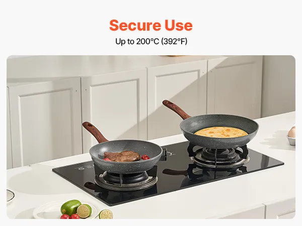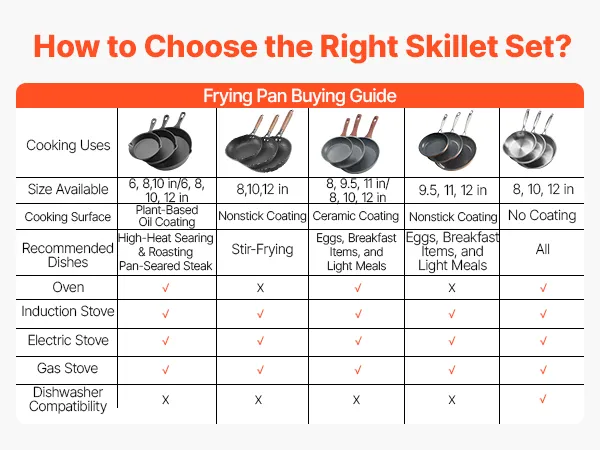 Compatible con todas las estufas: Apto para freír, sellar, cocinar al vapor, hervir a fuego lento, hornear y saltear. Este juego de sartenes es compatible con estufas de gas, eléctricas y de inducción para mayor flexibilidad de cocción