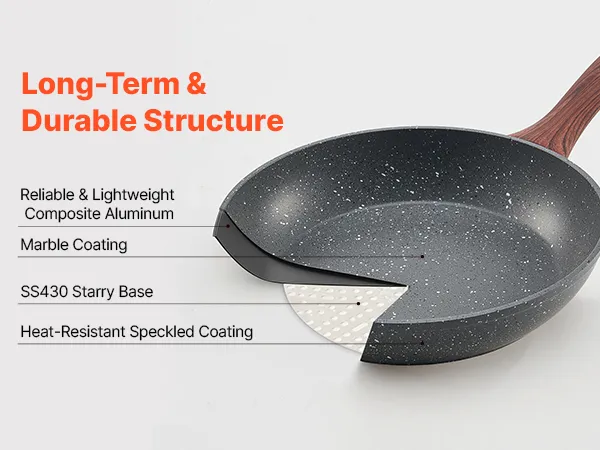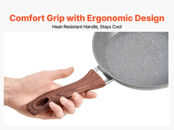 Agarre cómodo, se mantiene frío: El juego de sartenes de aluminio cuenta con un mango ergonómico de baquelita con protector térmico, lo que lo mantiene frío en la estufa. Su acabado con veta de madera con transferencia de agua le da un aspecto elegante y auténtico, con un agarre seguro y cómodo