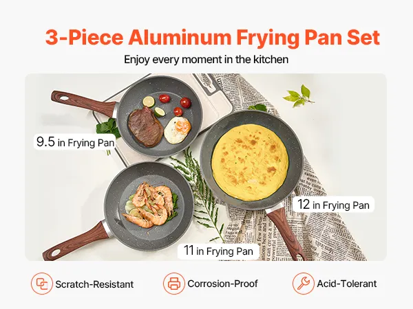 VEVOR Sartén de Aluminio para Huevos, Juego de 3 Piezas 250, 280 y 325 mm, Antiadherente, Resistente y con Mango Resistente al Calor, para Cocina de Chef, para Gas, Eléctrica e Inducción, Gris