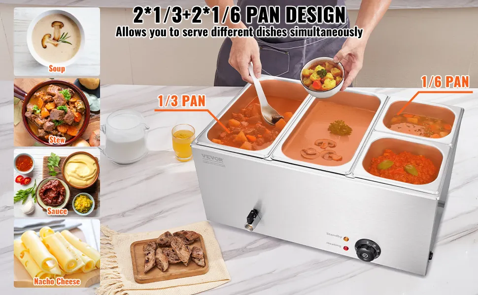 Incluye 4 sartenes: nuestro calentador de alimentos comercial viene con sartenes de 16,4 qt/15,5 L(2 de 1/3 y 2 de 1/6) acompañadas de sus respectivas tapas, lo que le permite servir diferentes platos simultáneamente. Siéntase libre de cambiar su menú de sopas y salsas a guisos o incluso queso para nachos y chocolate.