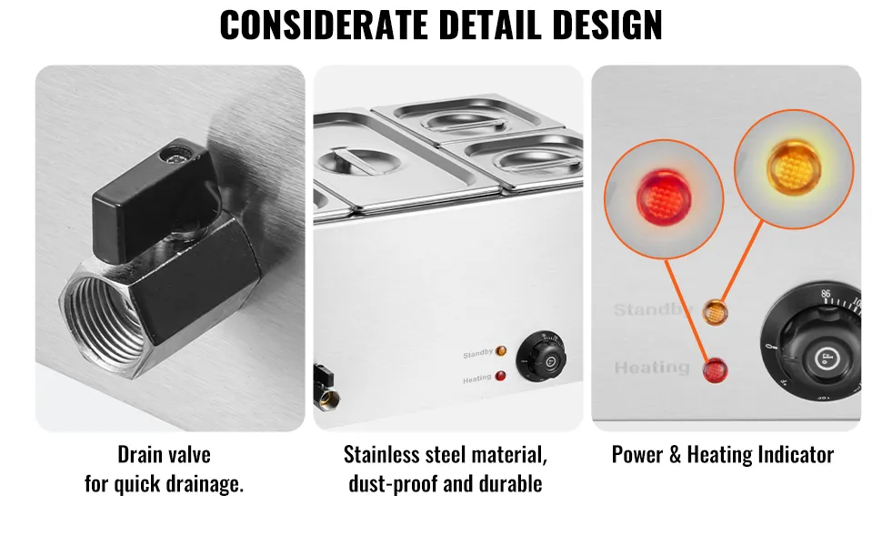 Detalles hechos para ti: el recipiente está diseñado cuidadosamente con marcadores de nivel de agua en el interior para un fácil mantenimiento del agua. El recipiente cuenta con un grifo para drenar el agua después del uso, lo que reduce la molestia de limpiar el interior de la máquina. Además, se incluyen dos cucharones con mango extra largo, perfectos para ollas profundas.