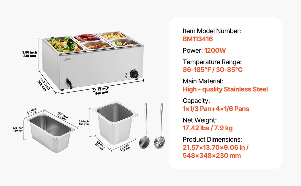 Calentamiento rápido, calidez duradera: este impresionante calentador de alimentos con sartenes viene con un potente tubo de calentamiento de acero inoxidable de 1200 vatios que calienta rápidamente la comida para mantenerla caliente y con un delicioso sabor. Puede ajustar la temperatura de salida según sus preferencias, que van desde 86 a 185 ℉/30 a 85 ℃, gracias al controlador de temperatura.