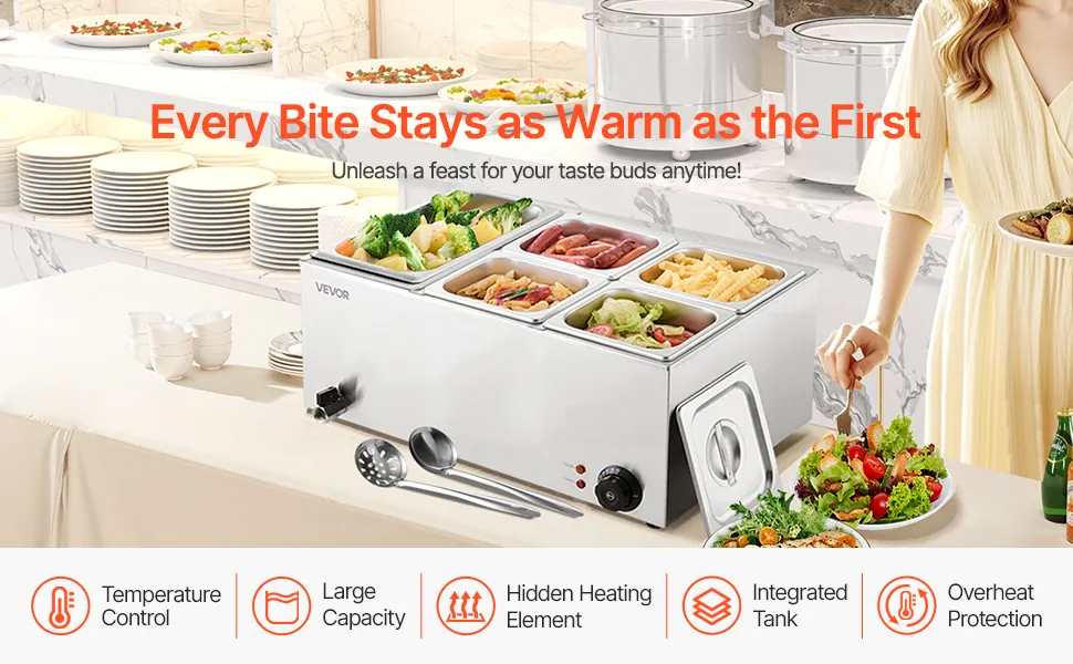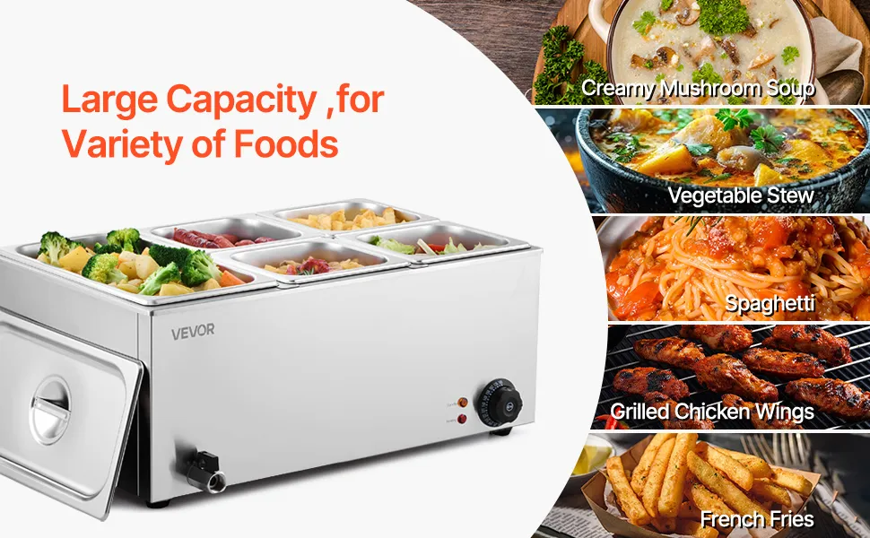 Incluye 5 sartenes: nuestro calentador de alimentos comercial viene con sartenes de 15,3 qt/14,5 L(1*1/3 + 4*1/6) acompañadas de sus respectivas tapas, lo que le permite servir diferentes platos simultáneamente. Siéntase libre de cambiar su menú de sopas y salsas a guisos, o incluso queso para nachos y chocolate.