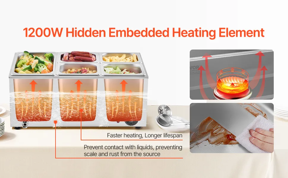 Este calentador de alimentos de acero inoxidable con capacidad para 5 sartenes cuenta con un diseño que evita quemaduras en seco y un sistema de reinicio para proteger contra daños. El rango de temperatura 30 a 85 ℃ le permite seleccionar la configuración perfecta para su comida.