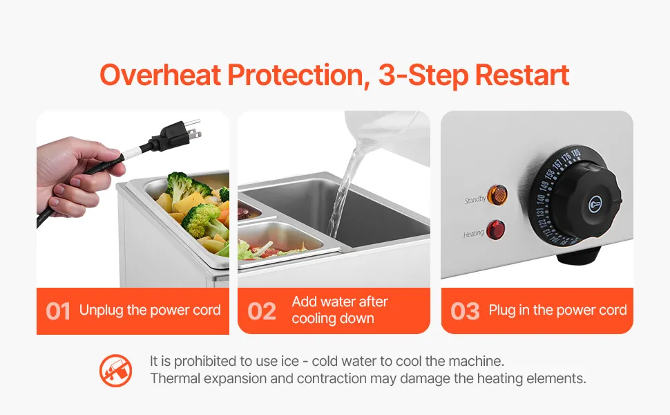Seguridad adicional: hemos actualizado nuestro calentador de alimentos con un nuevo diseño de "Indicador de quema en seco" y "Sistema de reinicio". La función anti-quema en seco detiene automáticamente el calentamiento de los alimentos cuando la temperatura supera los 248 °F(120 °C). Simplemente, agregue agua y apague la máquina; después de unos minutos, vuelva a enchufarla para reanudar el funcionamiento.