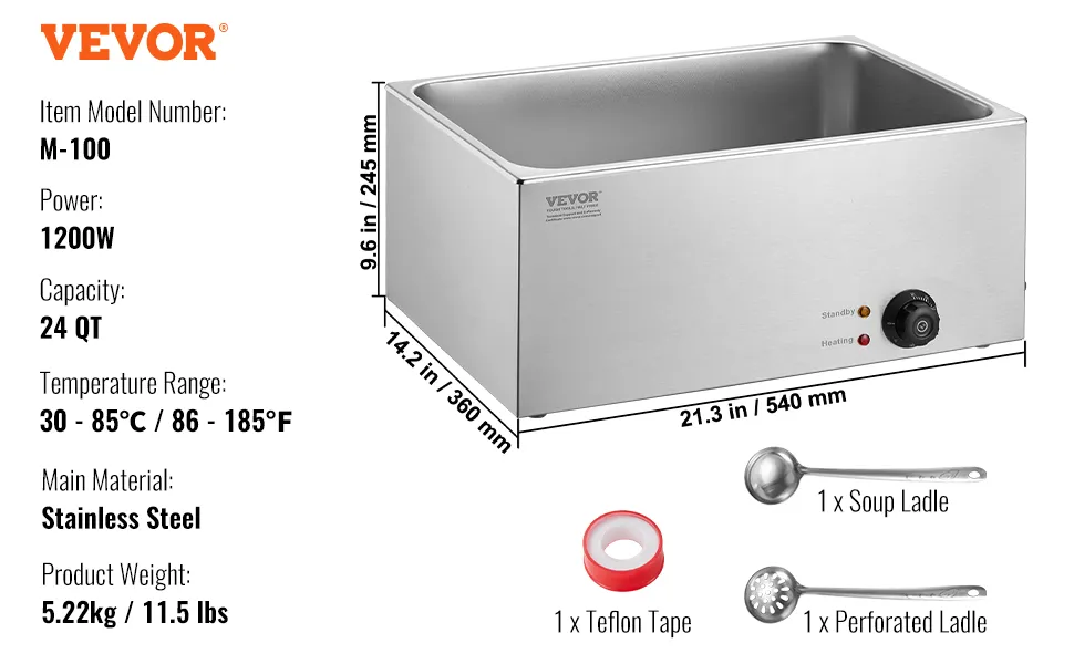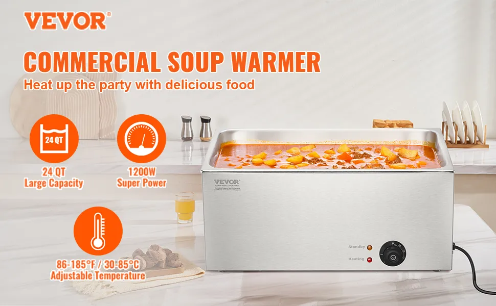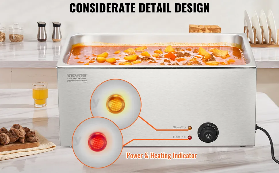 Construcción robusta de acero inoxidable: este calentador de alimentos está diseñado para durar, con una construcción robusta de acero inoxidable que puede soportar un uso constante y es fácil de limpiar y mantener. El recipiente tiene una pared engrosada(0,03"/0,8 mm de espesor) que proporciona una mayor solidez y tiene un sello de agua seguro.