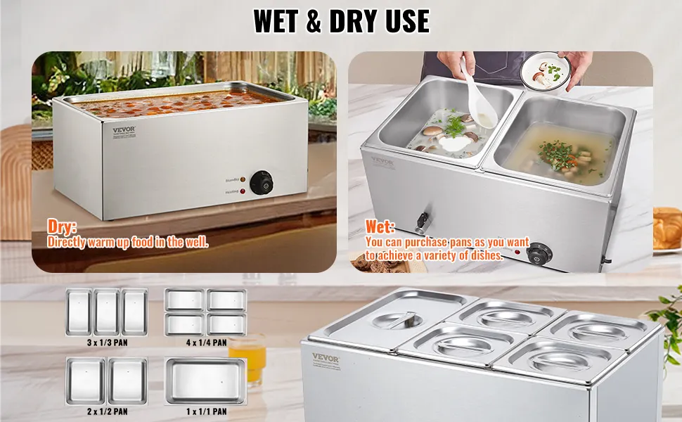 Uso húmedo o seco: nuestro calentador de alimentos comercial cuenta con un depósito de agua de 19 qt/18 L. Puede calentar alimentos directamente en el depósito o agregar agua al depósito para un uso flexible de las bandejas divisorias para crear una variedad de platos. Siéntase libre de cambiar su menú de sopas y salsas a guisos, o incluso queso para nachos y chocolate.