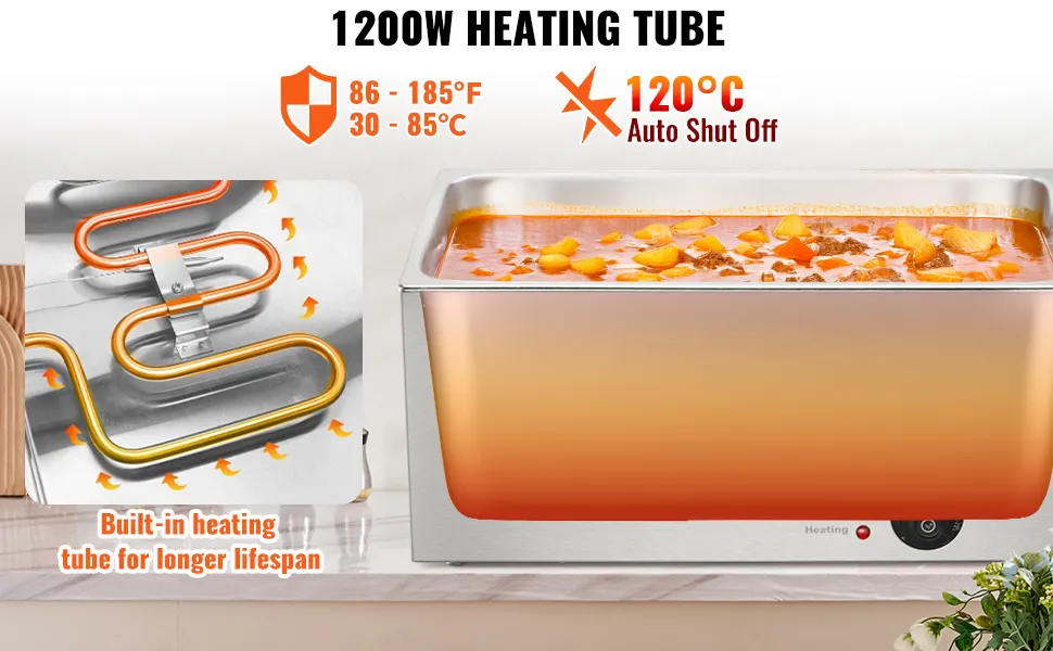Calentamiento rápido, calidez duradera: este impresionante calentador de alimentos viene con un potente tubo de calentamiento de acero inoxidable de 1200 vatios que calienta rápidamente la comida para mantenerla caliente y con un delicioso sabor. Puede ajustar la temperatura de salida según sus preferencias, que van desde 86 a 185 ℉ / 30 a 85 ℃, gracias al controlador de temperatura.