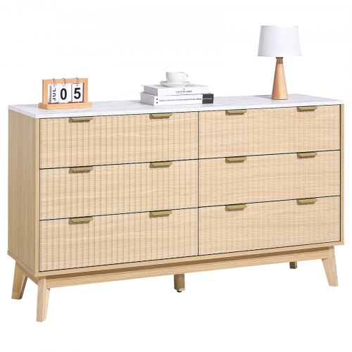 VEVOR Cómoda de 6 Cajones Acanalados de Madera 39,9 x 137,2 x 81,3 cm con Sistema de deslizamiento y Antivuelco Estilo Moderna y Minimalista para Sala de Estar y Pasillo, Color Madera Clara