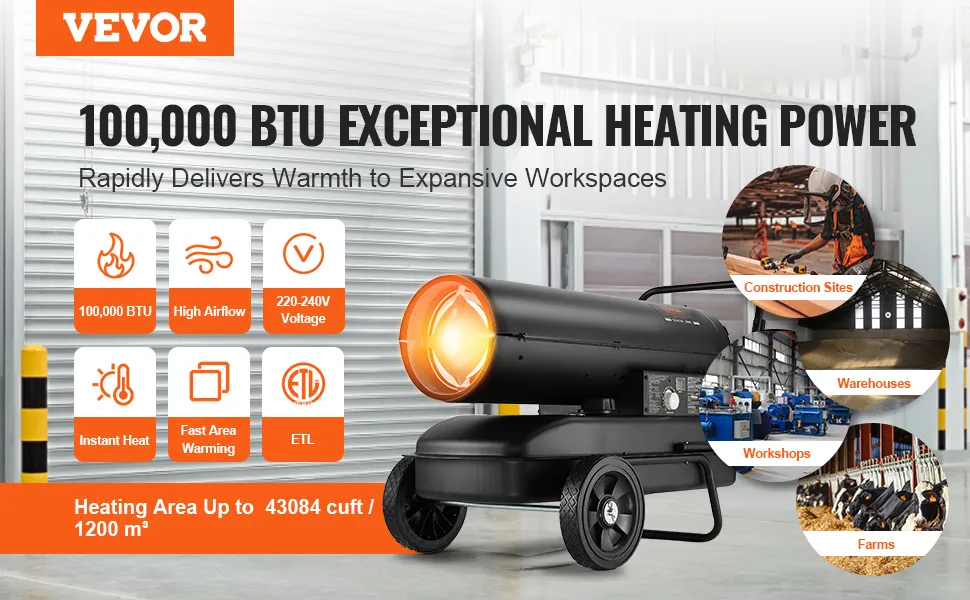 Calefacción para espacios de trabajo amplios: este calentador de queroseno de aire forzado proporciona 100 000 BTU de calor y calienta instantáneamente espacios como su lugar de trabajo, granero, taller, granja o áreas interiores de hasta 43 084 pies cúbicos(1200 m³). Garantiza el funcionamiento eficiente del equipo y la comodidad de los trabajadores.
