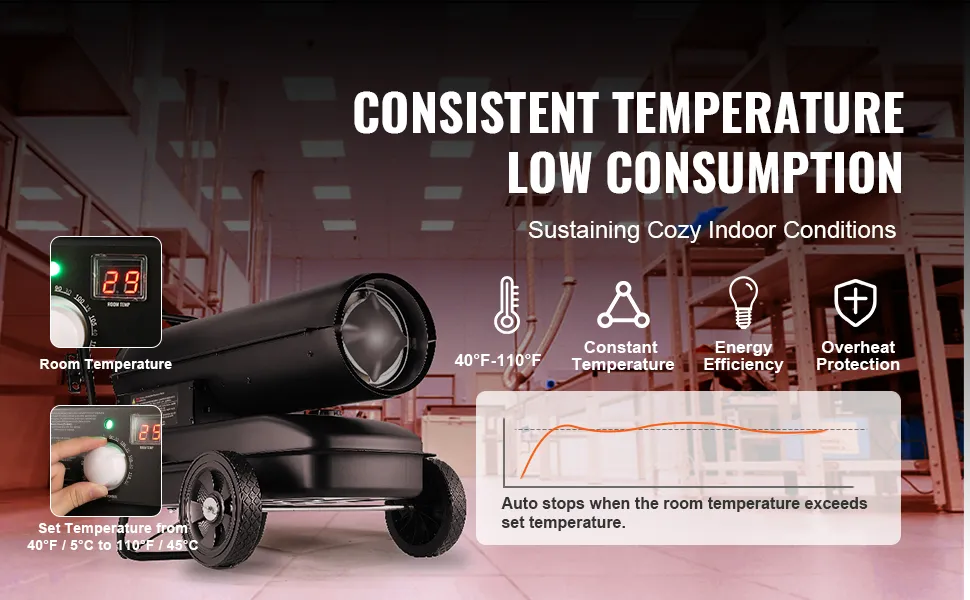 Este calentador de queroseno proporciona calor de manera eficiente para fábricas, graneros y granjas. Puede configurar la temperatura de 40 °F(5 °C) a 110 °F(45 °C) y se detiene cuando se alcanza la temperatura deseada, lo que ahorra energía.
