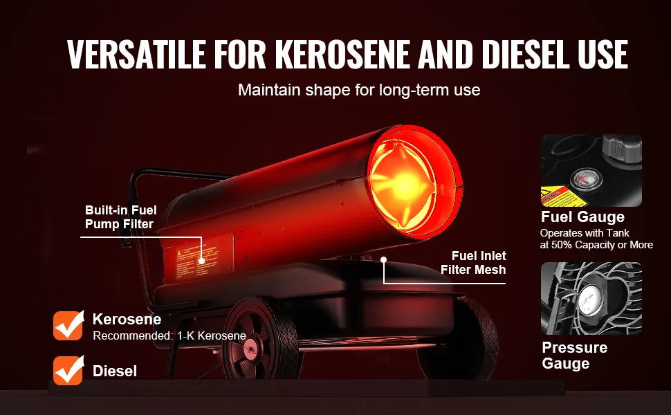 Este calentador, que admite tanto queroseno como diésel, ofrece flexibilidad de uso. Utilice un tipo de combustible a la vez. Se apaga automáticamente cuando el nivel de combustible es bajo, tiene un indicador de combustible y un filtro de combustible doble para un funcionamiento más limpio.