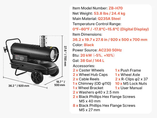 VEVOR Calentador de Aire Forzado de Queroseno Diésel 20 kW, Portátil con Ruedas, con Temperatura Ajustable y Ventilador, a Obras, Garajes, Almacenes, Talleres, Construcción y Exteriores, Negro
