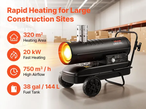 Calefacción rápida de toda la habitación: Este calefactor de aire forzado de queroseno proporciona calor rápido, ideal para espacios de hasta 320 m². Con 20 kW de potencia y un caudal de aire de 750 m³/h, consigue una rápida comodidad en grandes áreas