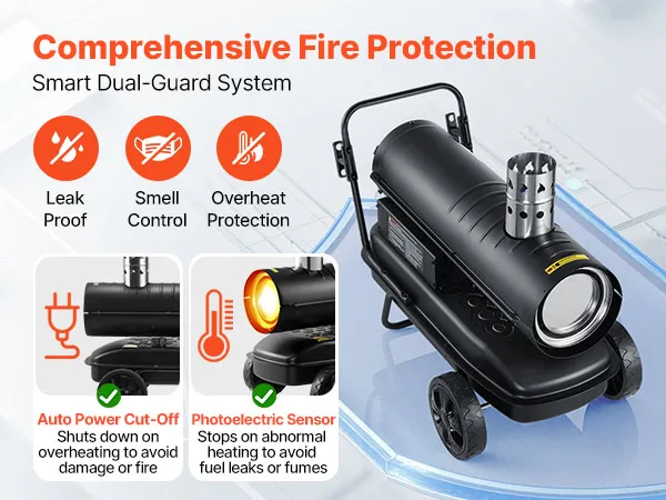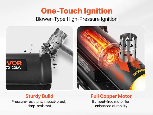 Equipado con un motor de cobre para una potencia estable y un uso prolongado. Su robusta carcasa soporta un manejo intensivo, lo que convierte a este calentador de queroseno en una opción confiable en obras de construcción.