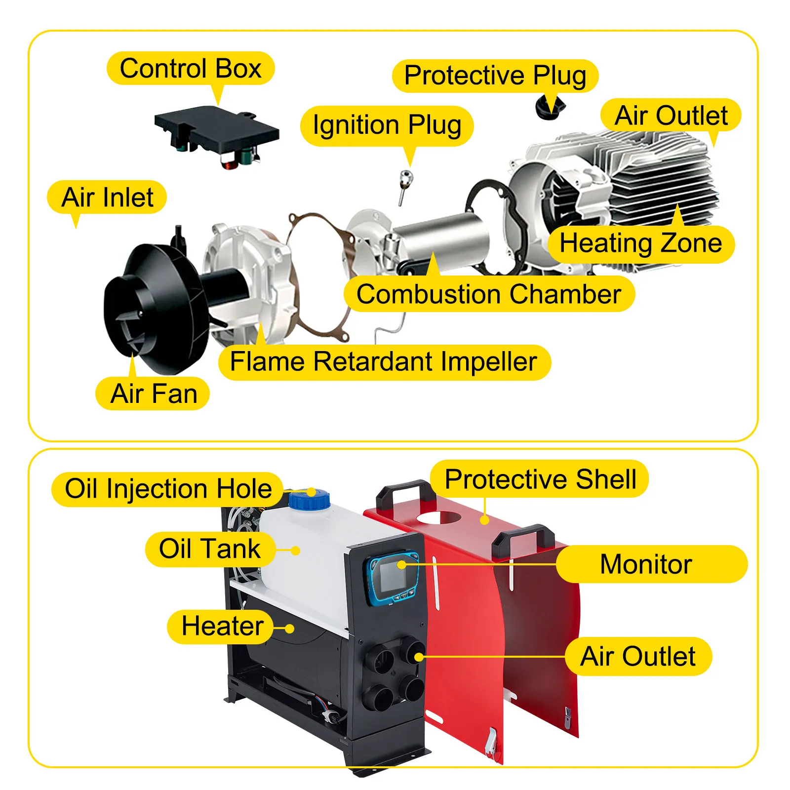 La cámara de combustión, la base y la escala de disipación de calor son todas piezas de aluminio con chorro de arena. Este calefactor de estacionamiento para diésel está construido integralmente, presentando una disipación de calor uniforme y una resistencia a las altas temperaturas.