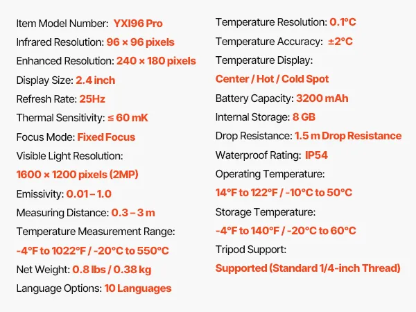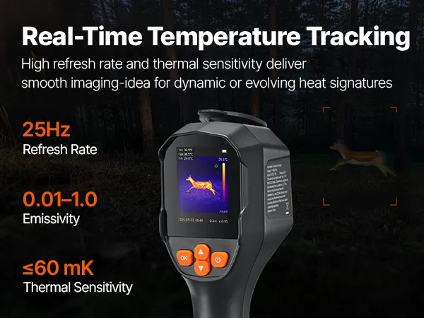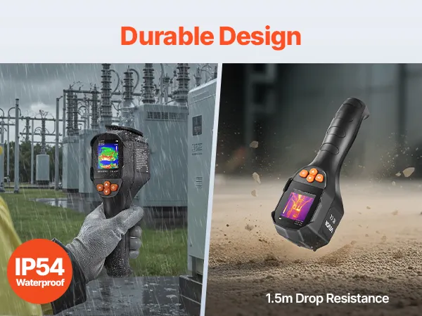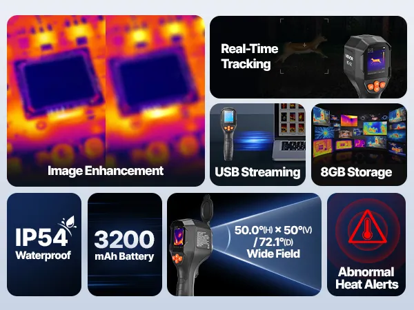 Múltiples mejoras: Esta cámara térmica está equipada con una batería de alta capacidad de 3200 mAh que ofrece hasta 7 horas de autonomía. Ofrece apagado automático, grabación de fotos y vídeos, e iluminación LED. Su cuerpo ligero pero robusto soporta caídas de hasta 1,5 m y, con protección IP54 contra el polvo y el agua, está preparada para entornos exigentes