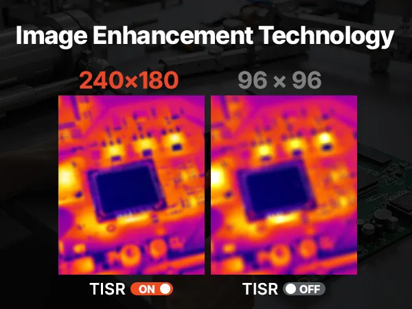 Tecnología de mejora de imagen: La cámara termográfica adopta la tecnología de mejora TISR, que eleva la resolución IR original de 96x96 a una superresolución de 240x180. Con una frecuencia de actualización de 25 Hz, una sensibilidad térmica ≤60 mK y un amplio campo de visión de 50,0°(H)x50°(V)/72,1°(D), junto con algoritmos de nitidez de imagen y un chip de IA de alto rendimiento, su pantalla LCD de 2,4 pulgadas captura y muestra los detalles del calor con mayor claridad