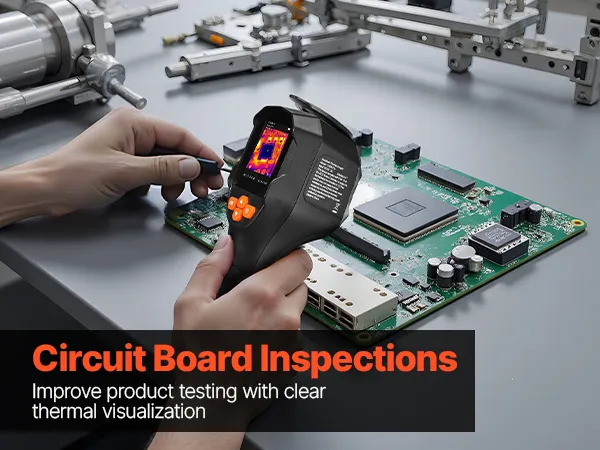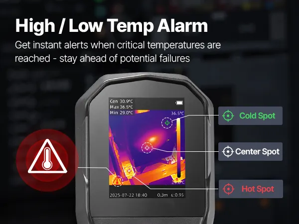 Detección rápida de fallos: Nuestra cámara termográfica infrarroja cuenta con alarmas integradas de alta/baja temperatura para monitorizar automáticamente las desviaciones y emitir alertas instantáneas. Le ayuda a identificar rápidamente zonas de sobrecalentamiento o baja temperatura, localizar fallos con precisión y detectar riesgos de calor ocultos, lo que permite visualizar claramente los posibles problemas para una acción temprana