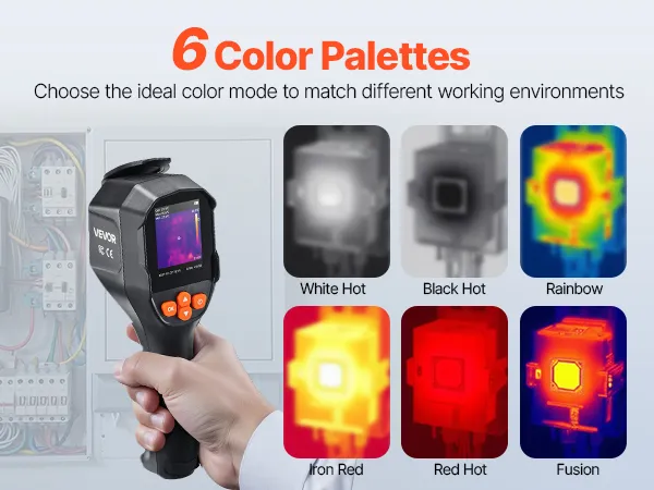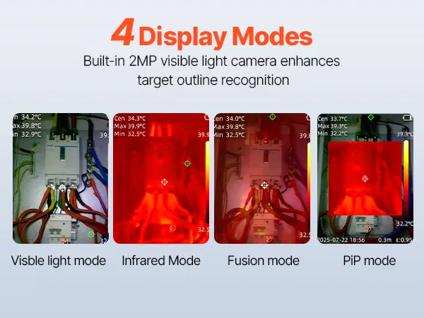 Medición precisa de temperatura: Esta cámara infrarroja admite un amplio rango de temperatura de -20°C a 550°C (-4°F a 1022°F). Registra automáticamente los puntos calientes y fríos y muestra datos de temperatura central, máxima y mínima. Con 4 modos de color térmico y 6 opciones de paleta, se adapta a diferentes necesidades de trabajo, ofreciendo imágenes más intuitivas y nítidas