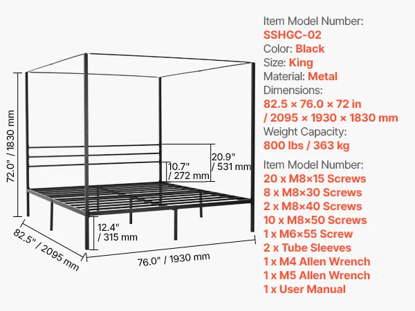 VEVOR Marco de Cama con Dosel de Tamaño King, Diseño de 4 Postes de Metal 2095 x 1930 x 1830 mm Soporte de Láminas de Acero Resistente Espacio de Almacenamiento Debajo, No Necesita Somier, Negro