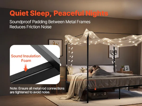 Diseño sin ruido: El acolchado insonorizado en las juntas metálicas reduce el ruido de fricción, lo que garantiza un entorno de sueño tranquilo y cómodo con la cama con dosel negro
