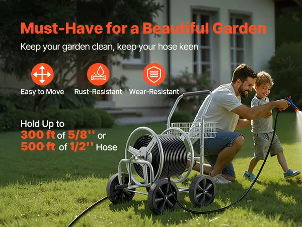 El carrete de manguera para exteriores VEVOR puede soportar una cantidad significativa de manguera. Tiene una capacidad de peso de hasta 300 pies (5/8''” hidráulico), lo que lo hace adecuado para jardines grandes o uso comercial. La capacidad de la boquilla garantiza que tenga suficiente longitud para varias tareas sin necesidad de múltiples carretes. Esta capacidad de servicio pesado es ideal para aquellos que necesitan una solución confiable y robusta para sus necesidades de riego. La construcción sólida le permite soportar el peso de esta maleza sin doblarse ni romperse.