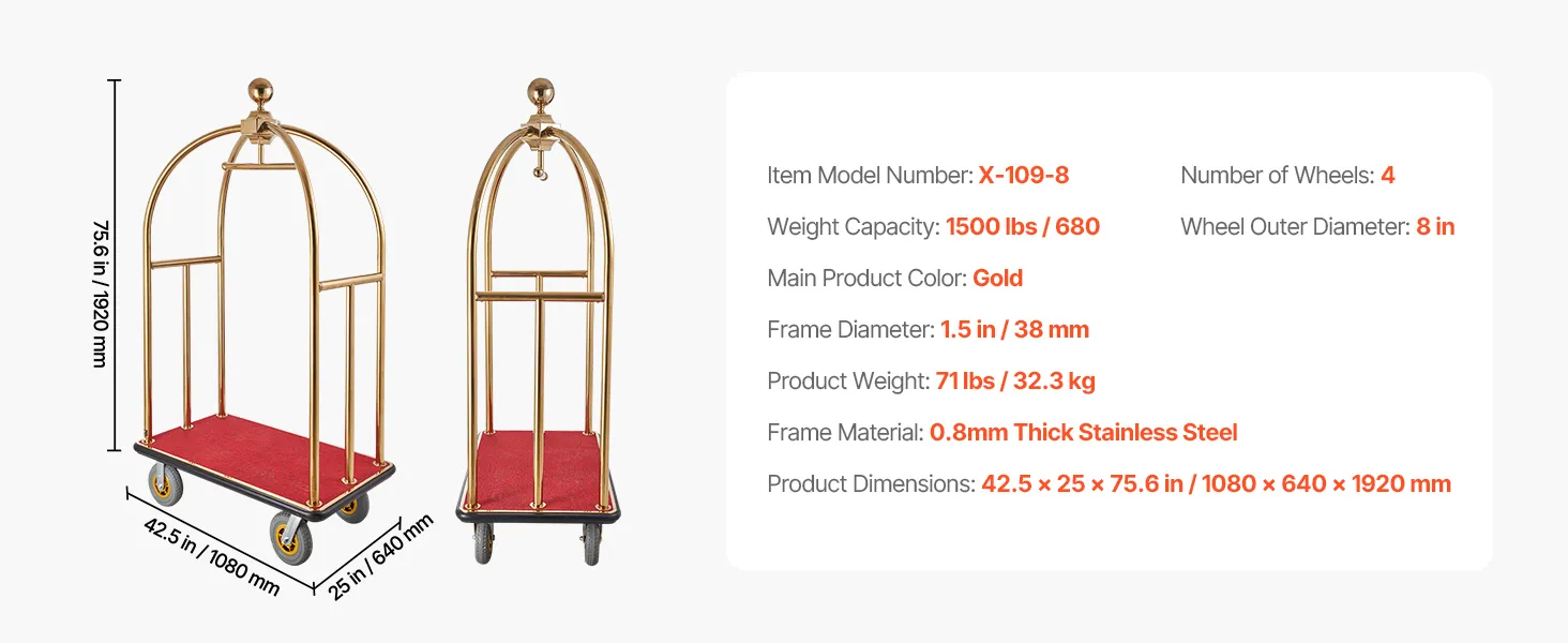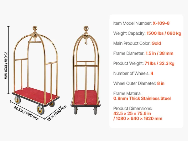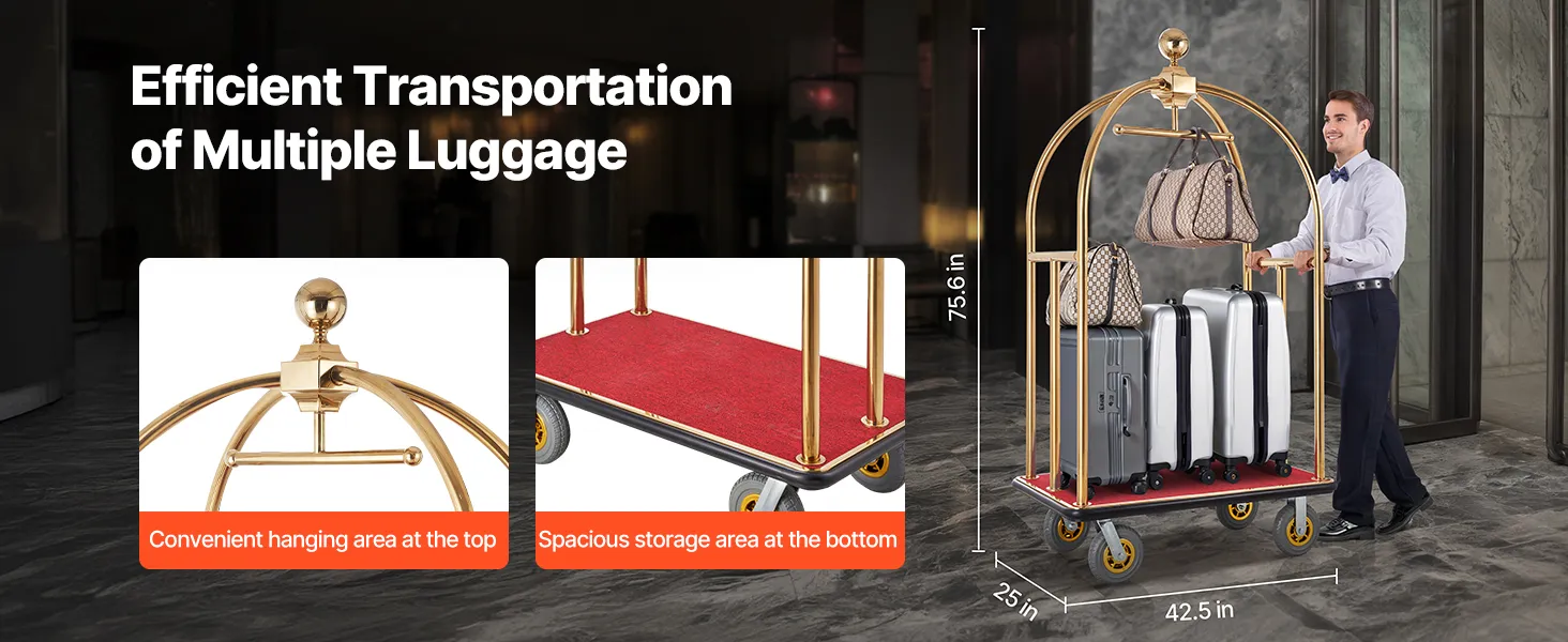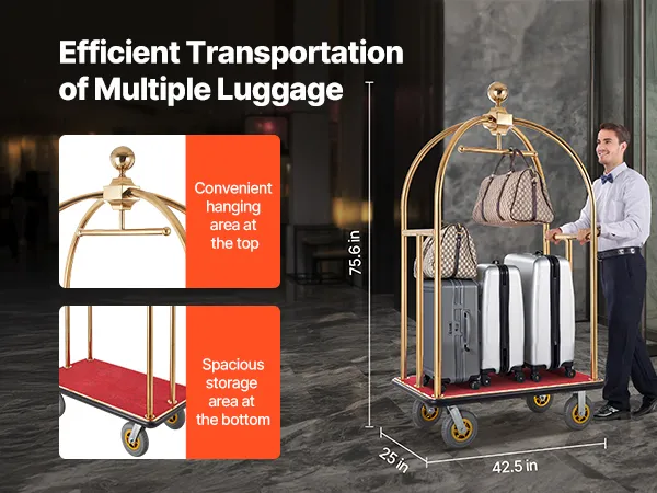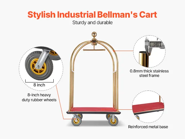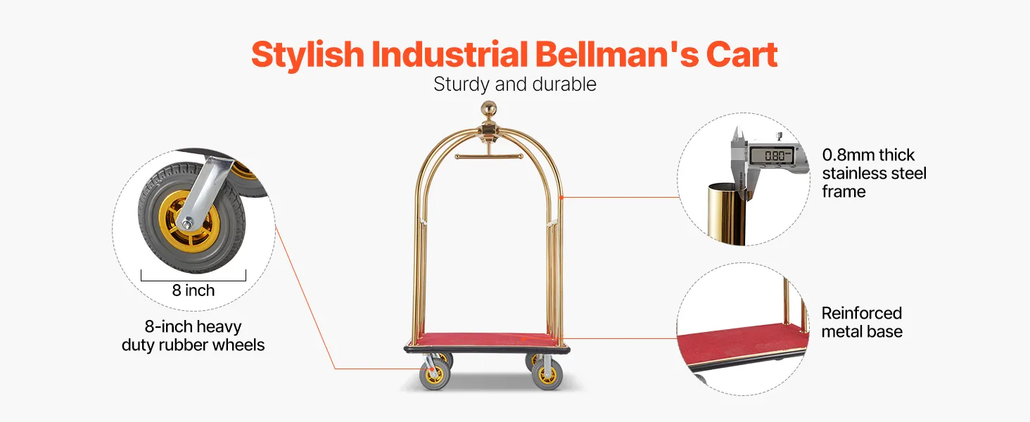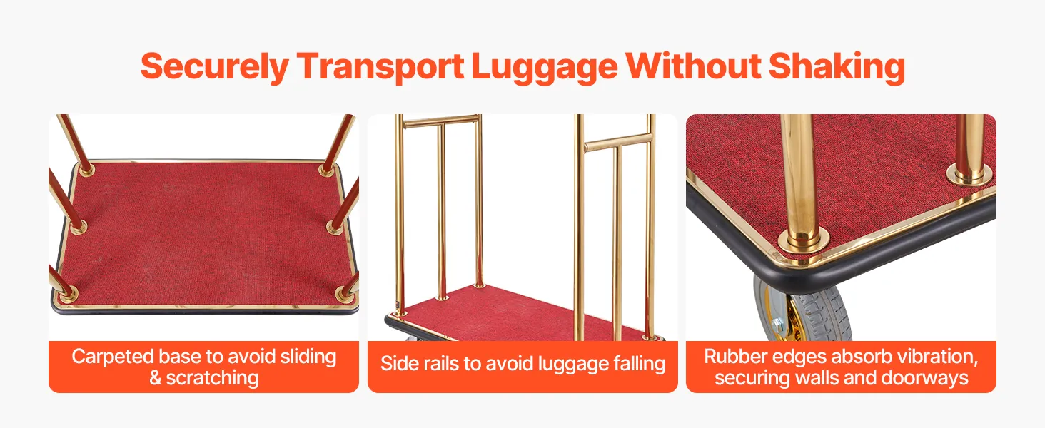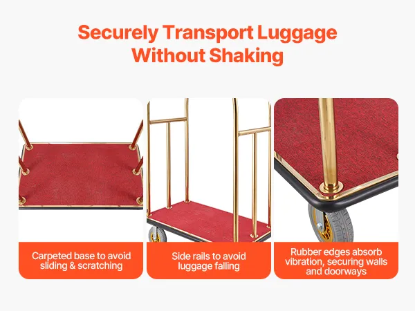 Cuatro características de protección: El carrito para botones de hotel tiene una base de alfombra roja antideslizante para asegurar el equipaje, además de barandillas laterales para evitar que los artículos se caigan. Los parachoques de goma absorben los impactos, evitando daños en las paredes o los ascensores. Una base de acero resistente agrega estabilidad adicional durante el uso