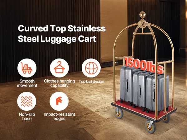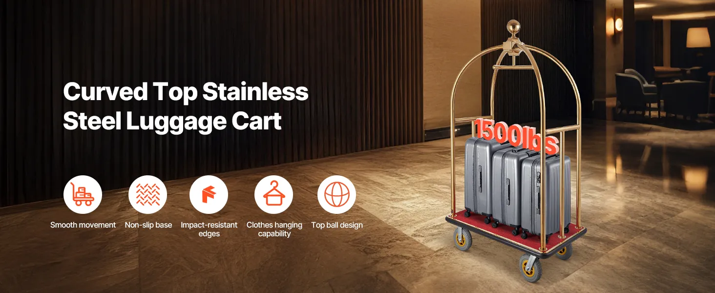 Marco de acero inoxidable resistente: Con una parte superior elegante y con forma de bola, este carrito para equipaje combina elegancia y funcionalidad. Fabricado en acero inoxidable de 1 mm de espesor, es resistente al óxido y duradero. Ya sea para transportar equipaje o para agregar estilo al vestíbulo de su hotel, es la mejor opción tanto por su durabilidad como por su diseño