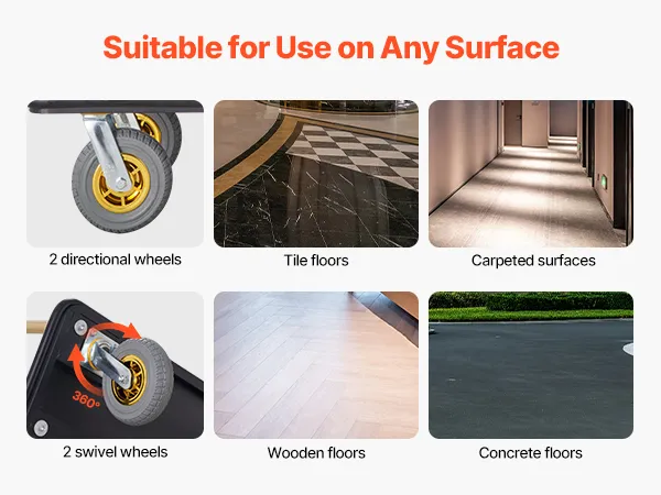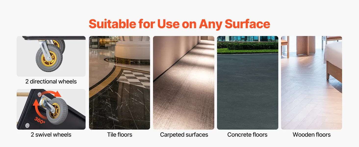 Ruedas silenciosas y suaves: Este carrito para equipaje de hotel tiene 4 ruedas de goma resistentes (2 direccionales y 2 giratorias), lo que facilita su deslizamiento sobre diversas superficies, como baldosas, madera o alfombras. Funciona silenciosamente y las ruedas de goma mantienen los pisos libres de rayones