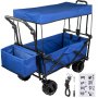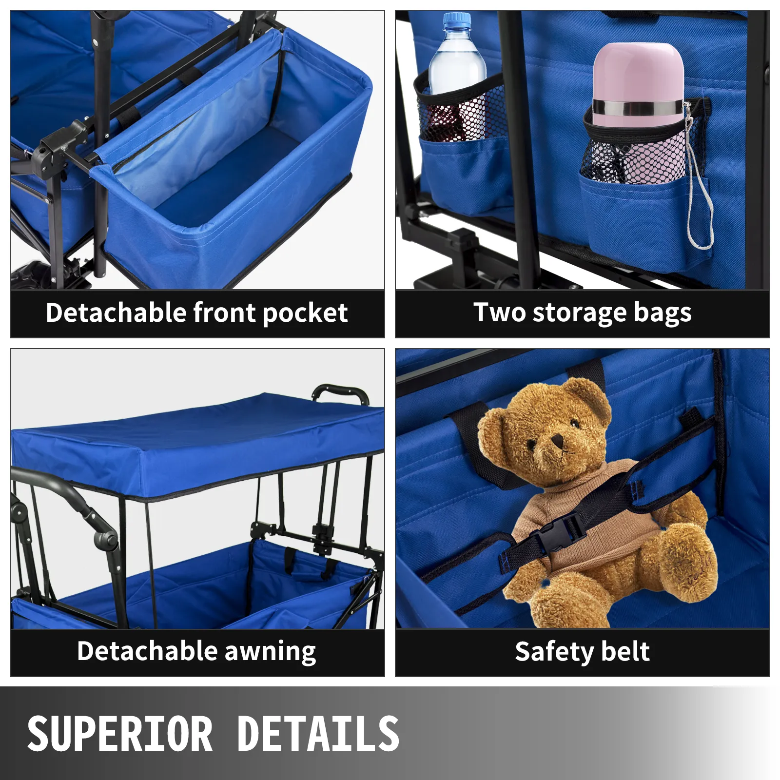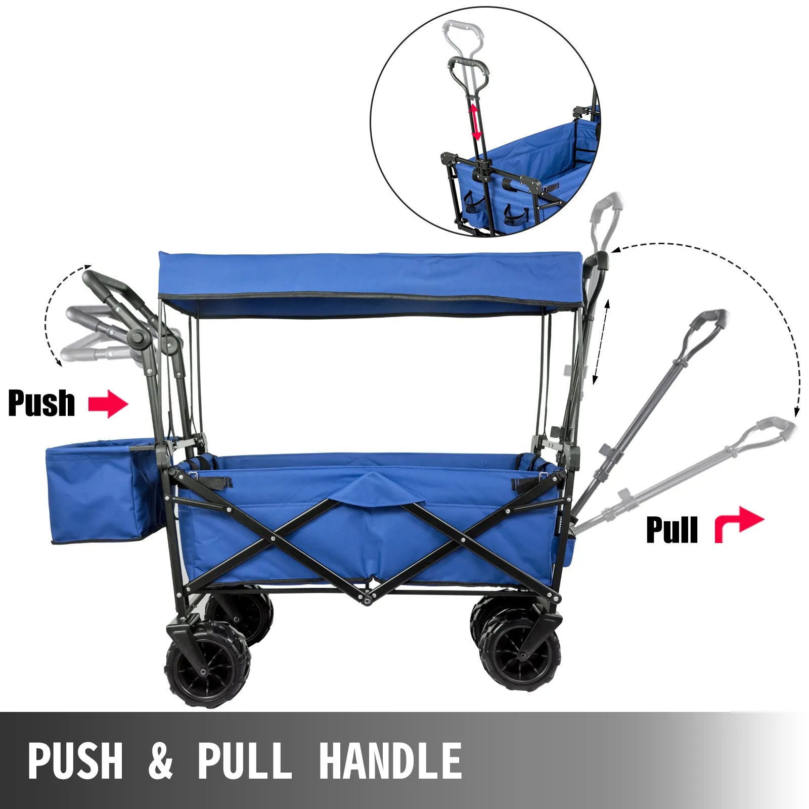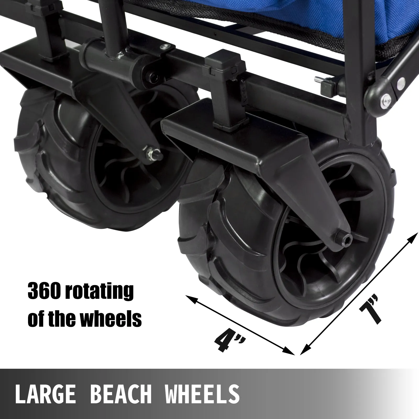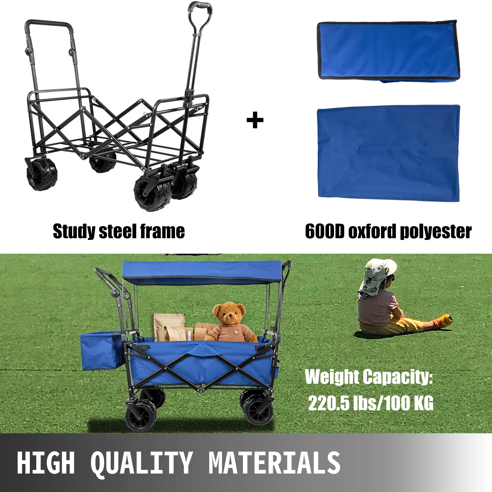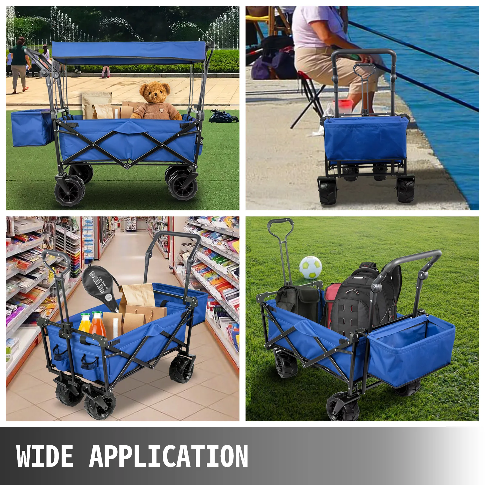 El carrito de vagón plegable azul utilitario con dosel desmontable y ruedas todoterreno está hecho de tela Oxford prémium 600D y un marco de acero resistente, la rueda todoterreno giratoria de 360 grados se adopta para hacer que su estacionamiento, empuje y tire sea más conveniente. Un espacio de almacenamiento más grande, una canasta de almacenamiento adicional y dos bolsas de malla le brindan un espacio más grande. Se puede abrir y plegar fácilmente en segundos. Una herramienta práctica y conveniente para empacar y mover cosas en actividades al aire libre.