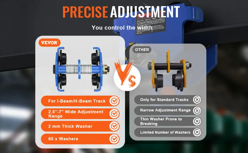 ¡Olvídate de los carritos habituales! El carro de viga de empuje de VEVOR viene con arandelas extragruesas, lo que amplía su ajuste para diferentes vigas. Adaptarse es rápido, fácil y, seamos realistas, bastante satisfactorio.