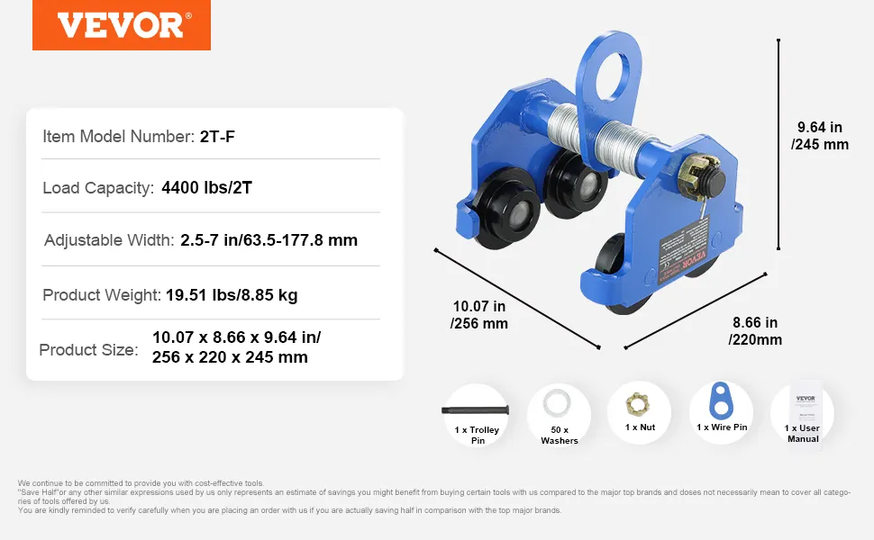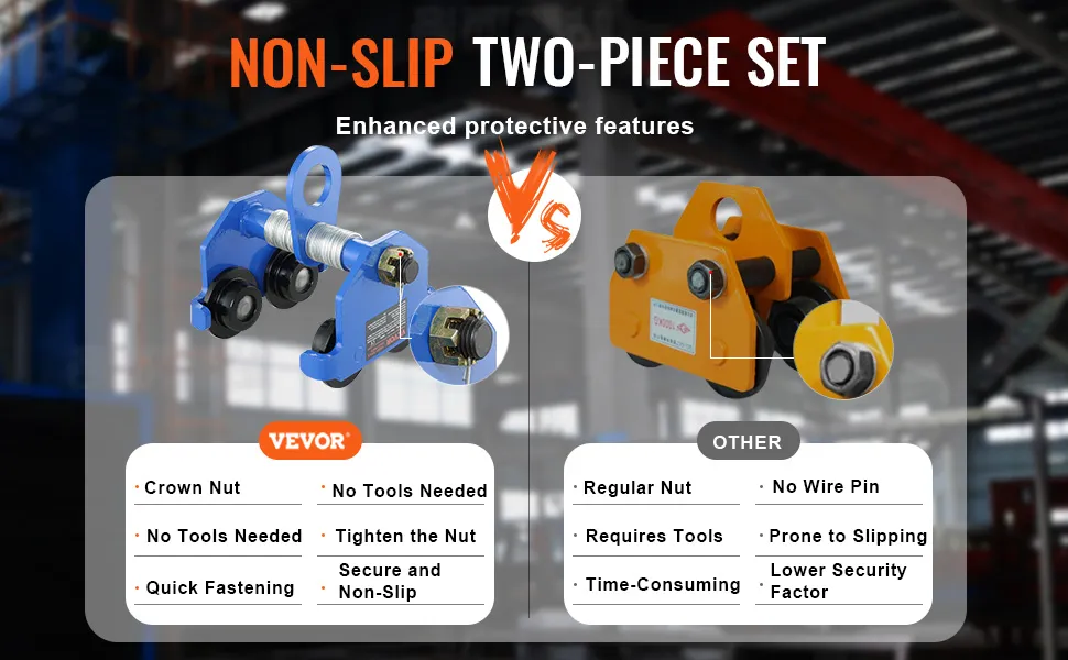 La seguridad es el aspecto más importante de la elevación. El carro de vigas en I ajustable VEVOR incluye varias características de seguridad para garantizar operaciones seguras. Estas incluyen una tuerca hexagonal, un parachoques anticolisión y un pasador de alambre anticaída. Todas estas características trabajan juntas para prevenir accidentes y extender la vida útil del carro. Nuestro diseño de carro garantiza que se mantenga estable y seguro durante el uso. Estas características de seguridad garantizan que sus tareas de elevación se realicen de manera segura. Las medidas de seguridad adicionales hacen que este carro sea confiable para cualquier trabajo de elevación.