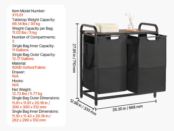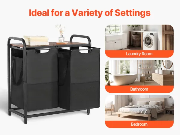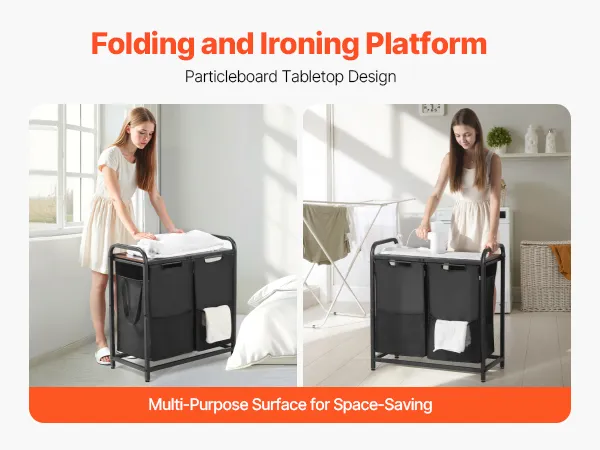 VEVOR Cesta para la Colada con Tablero de Madera, Clasificador de Ropa 668 x 330 x 710 mm con 2 Bolsas Extensibles de Tela Oxford 600D y Estructura de Metal, Clasificador de Ropa para Baño, Negro