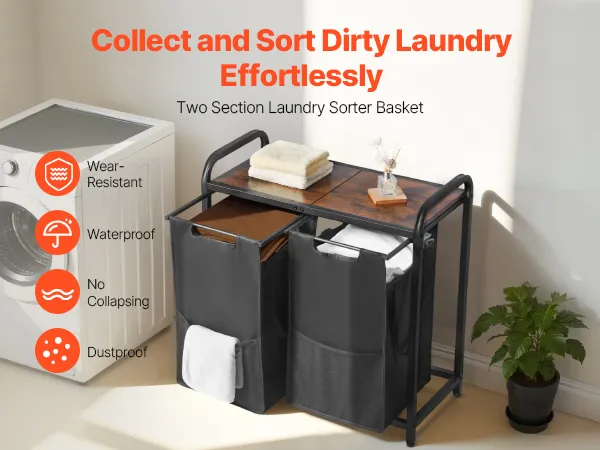 Dos compartimentos con una capacidad de 24,34 galones, hechos de tela duradera, impermeable y resistente a las curvas, ideal para clasificar ropa clara/oscura, húmeda/seca o de adulto/niño para mantener su hogar limpio y ordenado.
