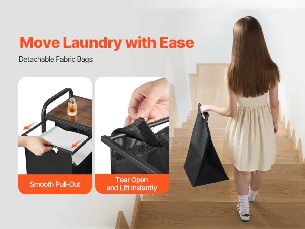 Las bolsas extraíbles con un diseño de extracción suave y asas permiten que el clasificador de ropa transporte la ropa a la lavadora de una sola vez, ahorrando tiempo y esfuerzo.