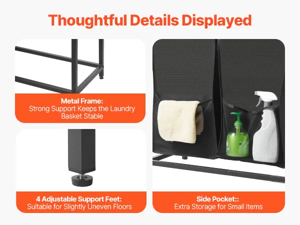La estructura metálica reforzada garantiza una estabilidad y durabilidad duraderas. Cuatro patas ajustables garantizan estabilidad en suelos irregulares. Incluye un bolsillo lateral para artículos pequeños como calcetines y bolsas de ropa, lo que mantiene el área de lavado ordenada y organizada.