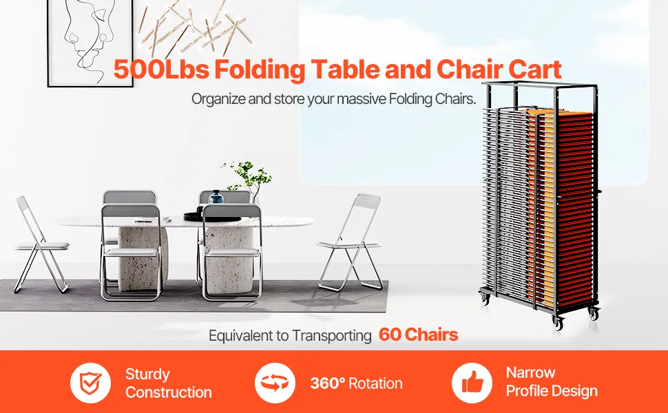 Almacenamiento eficiente: Este carrito para sillas de comedor, con dimensiones de 2010 x 1150 x 500 mm, tiene una capacidad de peso máxima de 500 libras y puede transportar hasta 60 sillas a la vez, lo que permite una instalación rápida y ahorra espacio