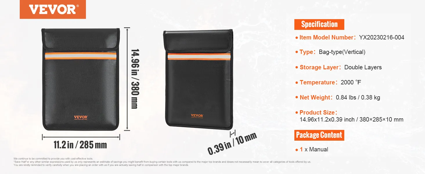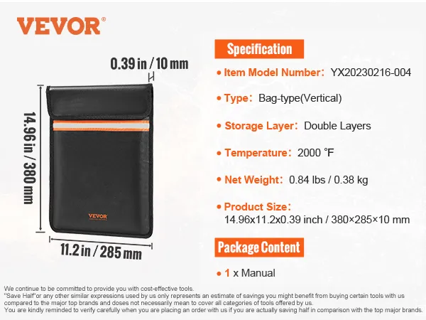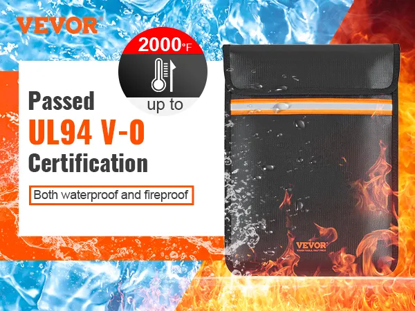 La bolsa para documentos ignífuga VEVOR cuenta con un revestimiento de silicona que no pica y una construcción de fibra de vidrio de doble capa, que ofrece protección contra temperaturas de hasta 2000 °F. Sus materiales robustos crean una barrera para aislar el aire y al mismo tiempo repeler el agua, lo que garantiza que sus objetos de valor permanezcan seguros en condiciones extremas. Esta bolsa es la máxima protección para documentos importantes y otros artículos.