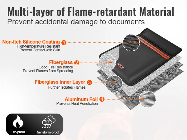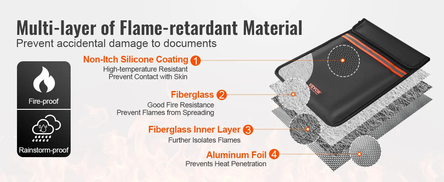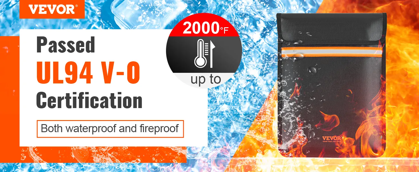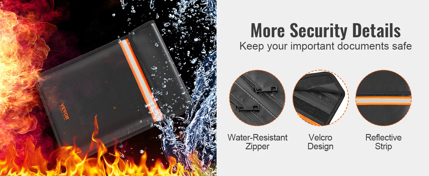 • Ignífugo y resistente al agua: La bolsa para documentos ignífuga de VEVOR está fabricada con materiales ignífugos e impermeables de primera calidad (revestimiento de silicona que no pica y fibra de vidrio de doble capa). ¡Puede soportar temperaturas de hasta 2000 °F! El revestimiento de silicona suave y agradable para la piel no solo resiste el calor, sino que también aísla rápidamente el aire, lo que garantiza la máxima protección para sus documentos importantes. Además, su superficie repelente al agua evita que se filtren gotas de agua.