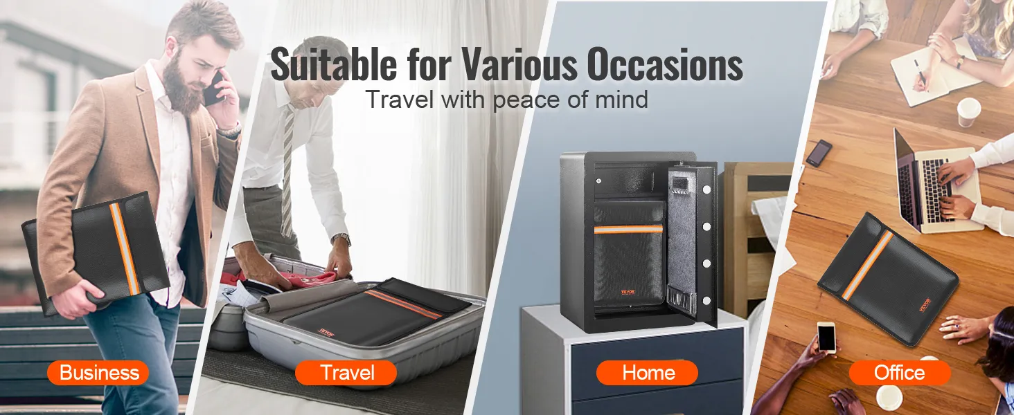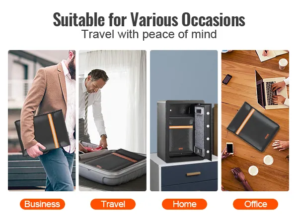 Su diseño liviano y portátil lo convierte en un gran compañero para viajar con documentos importantes. La bolsa ignífuga también es adecuada para almacenar archivos valiosos en cajas fuertes y oficinas, brindando protección adicional.