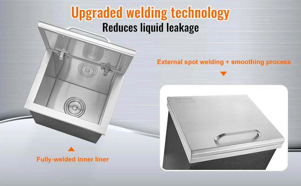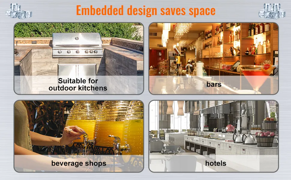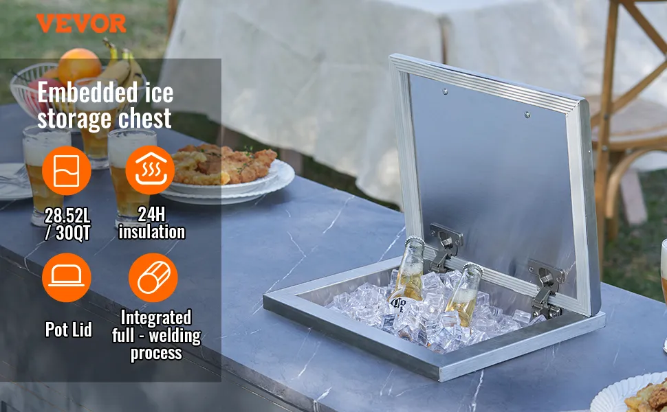 Esta hielera empotrable VEVOR ofrece opciones versátiles para cenar y entretenerse al aire libre. Su diseño versátil le permite cumplir varios propósitos durante eventos al aire libre. Puede mantener las bebidas frías, guardar guarniciones o incluso usarla como una hielera improvisada para alimentos perecederos. Esta flexibilidad la convierte en una herramienta esencial para organizar reuniones al aire libre exitosas. No importa si está haciendo una barbacoa, organizando fiestas de etiqueta o disfrutando de una cena ocasional, esta hielera siempre está lista para cualquier ocasión al aire libre. Por lo tanto, sirve como un complemento práctico y conveniente para su barra de hielo de cocina al aire libre.