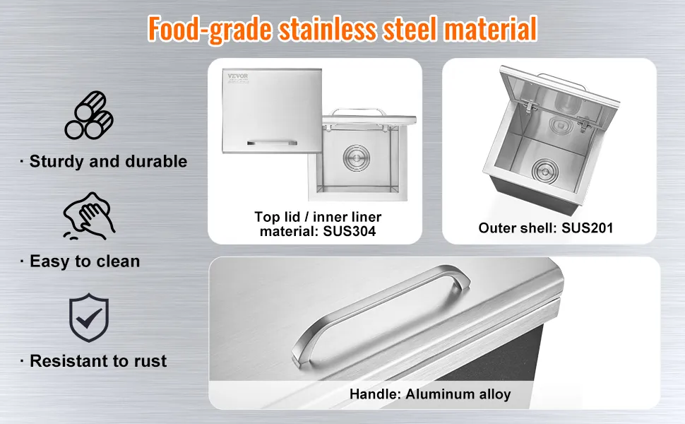 El acero inoxidable de alta calidad forma la base de este enfriador de hielo de acero inoxidable, lo que garantiza su durabilidad. Utilizamos material SUS304 para la tapa superior y el revestimiento interior para garantizar la durabilidad y la higiene. Además, la carcasa exterior SUS201 añade robustez a su estructura. Esta combinación de materiales garantiza la longevidad, así como la resistencia al desgaste. Su elegante acabado de acero inoxidable no solo añade un elemento de elegancia a la barra de hielo de su cocina al aire libre, sino que también hace que sea fácil de limpiar y mantener. Su diseño para resistir los elementos lo hace adecuado para uso al aire libre. Los materiales de primera calidad garantizan que siga siendo una parte confiable de su cocina al aire libre durante años.
