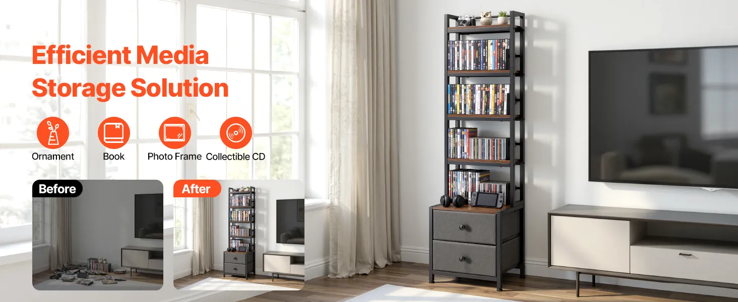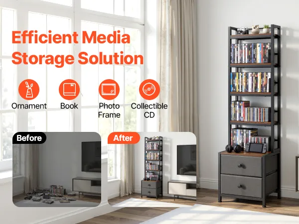 Diseño versátil: Más que un simple mueble para CD y DVD, este estante también permite guardar libros, adornos y objetos de colección con facilidad. Su diseño flexible se adapta a sus diversas necesidades, ayudándole a crear un espacio más personalizado y funcional