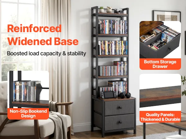 Equipado con una base ampliada, este mueble para guardar DVD ofrece mayor estabilidad, manteniéndolo firmemente en su lugar. Su sólida construcción protege su valiosa colección, brindándole tranquilidad en el uso diario.