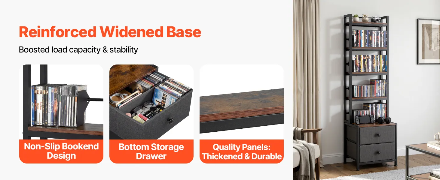Almacenamiento flexible: Con sujetalibros antideslizantes, nuestro mueble de almacenamiento multimedia evita que se vuelquen, mientras que el cajón inferior ofrece espacio oculto para objetos pequeños. Permite organizar diversas colecciones de forma eficiente y ordenada