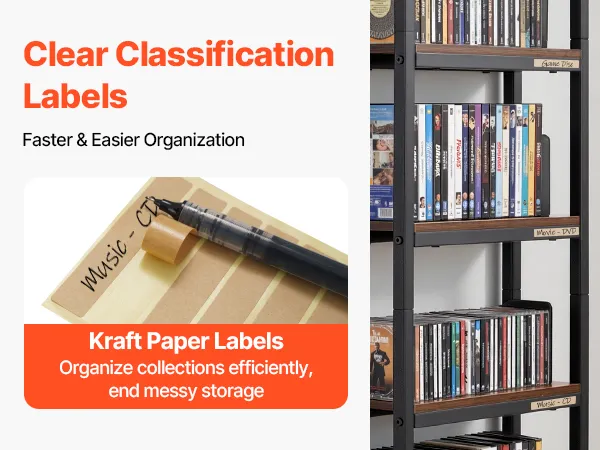Etiqueta cada compartimento de nuestra estantería de películas con marcadores de papel kraft para que pueda clasificar e identificar rápidamente los DVDs. Deja de perder el tiempo buscando entre colecciones desordenadas.