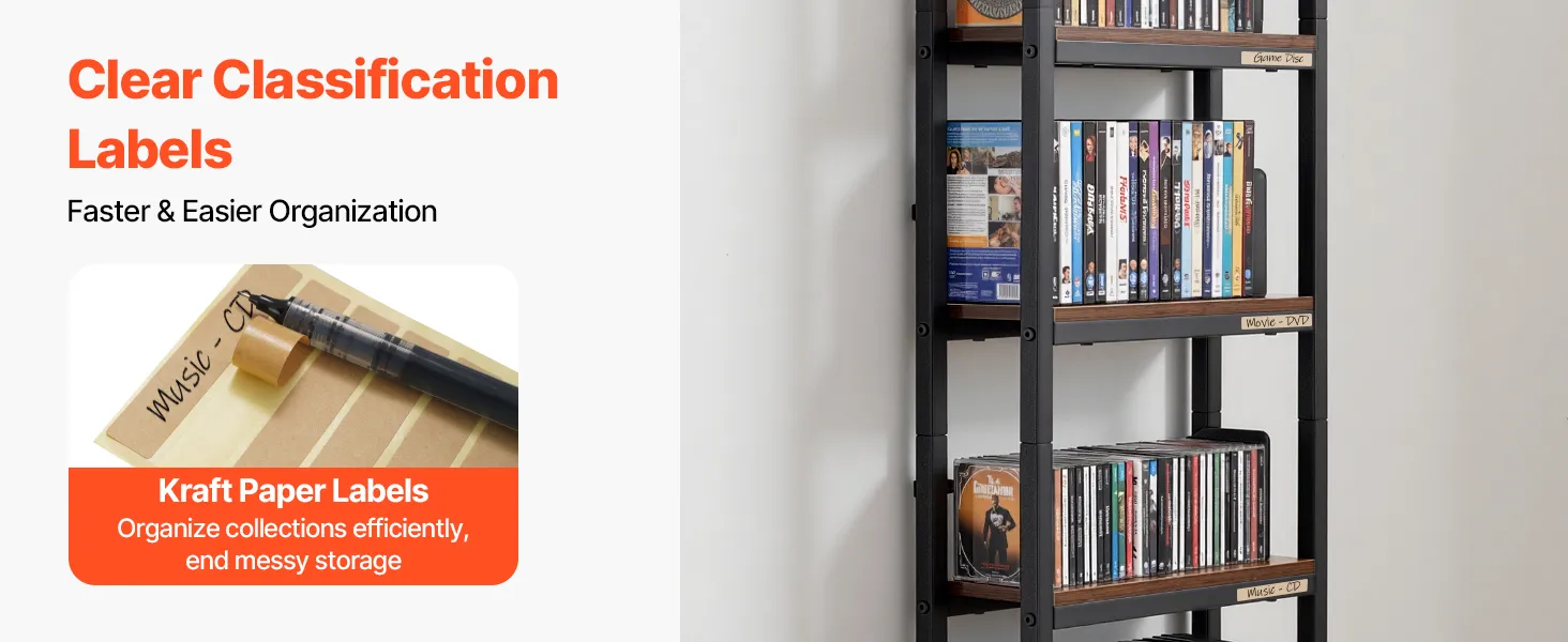 Almacenamiento ordenado y organizado: Este mueble para CD y DVD incluye etiquetas adhesivas de papel kraft para que pueda marcar cada compartimento a su gusto. Clasifique e identifique fácilmente los objetos de colección de un vistazo, manteniendo su colección de medios siempre organizada